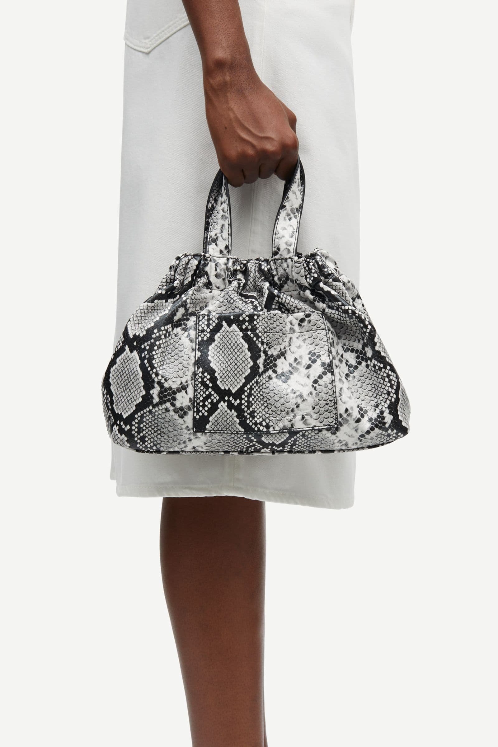 Skuldertaske med print, håndtag og aftagelig, justerbar rem. Magnetisk trykknaplukning på indersiden. Påsyet lomme med præget Samsøe Samsøe-logo foran og slidslomme indvendigt. Sølvfarvede metaldetaljer. Støvpose medfølger. Twill-for. Hovedmaterialet er fremstillet af genanvendt læder.